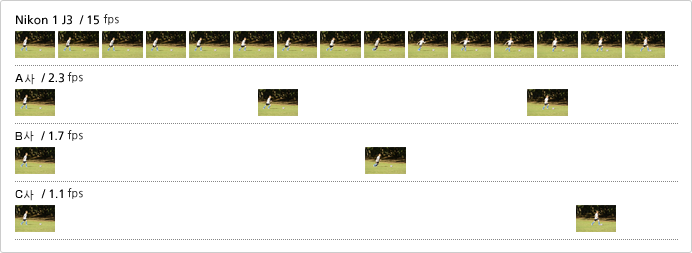 AF추적 중인 상태에서 세계 최고 속도※고속 연속 촬영을 실현한 Nikon 1 J3에서는 1초에 최대 15컷의 촬영이 가능합니다. 모든 컷에서 피사체를 추적하면서, 초점맞춤을 계속하므로, 추적이 어려웠던 순간들도 샤프하게 촬영해 낼 수 있습니다. 더욱이 30프레임/초나 60프레임/초에 설정하고, 1번째 프레임에 AF를 고정시켜 연사 촬영이 가능합니다. 예를 들면 골프 스윙과 같이, 피사체가 멈춰선 상태에서 재빠른 움직임을 포착할 때 효과적입니다.