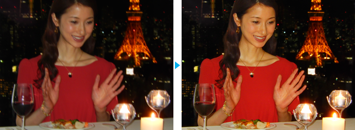씬 모드에서 「야경포트레이트※」를 설정하는 것만으로도, 자동 연사 합성 기술이 구사되어 흔들림이나 노이즈를 경감. 손으로 든 촬영에서도 실패 없이 깨끗하게 촬영됩니다.