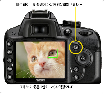 컴팩트 디지털 카메라로 촬영하는 처럼, 액정 모니터를 사용하여 촬영하는 라이브 뷰 촬영. 파인더를 들여다 보기 어려운 하이 앵글과 로우 앵글에서의 촬영, 약 100%의 시야 율로 풍경이나 인물 촬영 등에서 구도를 확실히 결정하여 촬영하고 싶을 때 유용합니다. 액정 모니터에는 커서 보기 쉬운 3인치, 약 92만 점(VGA)을 채용. 초점 조작은 멀티 셀렉터에서 포커스 포인트를 이동시키는 것으로 좋아하는 장소를 마음대로 선택합니다. 삼각대를 사용하여 꽃이나 생활 소품등의 클로즈 업 촬영에서는, 피사체를 약 9.4배까지 확대 표시하면서, 차분히 초점 맞춤이 가능합니다.