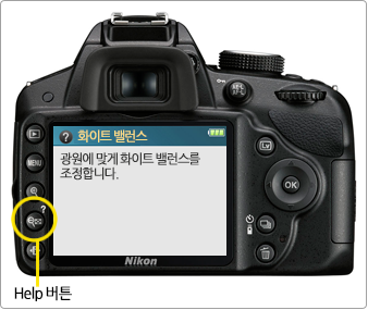메뉴 화면에서 설정할 때 모르는 기능이나 항목이 있어도, 도움말 단추에서 바로 해결할 수 있습니다. 디지털 일안 리플렉스 카메라가 처음인 경우에도, 사용면서 배울 수 있는 편리한 기능입니다.