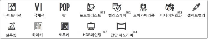 ● D-라이팅[인물우선(ON/OFF)]●적목보정●트리밍(3:2/4:3/5:4/1:1/16:9)●모노톤(흑백/세피아/쿨)●필터 효과 주기(스카이라이트/웜 톤/적색강조/녹색강조/청색강조/크로스 스크린/소프트)●컬러 커스터마이즈●화상합성●RAW 현상 ●리사이즈●간단 리터치●기울기 보정●왜곡보정●어안 효과●윤곽그림●포토 일러스트●컬러 스케치●아오리 효과●미니어쳐 효과●셀렉트 컬러●동화상 편집