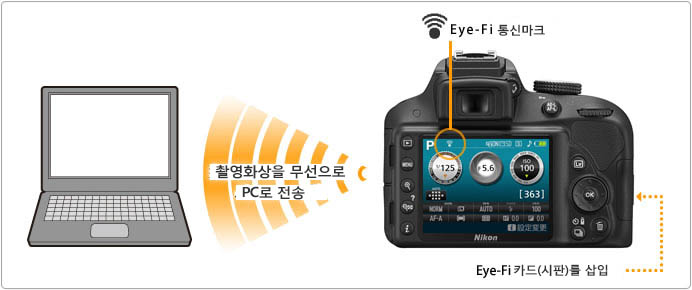 D3300에서 촬영한 사진이나 동화상을 카메라에서부터 무선 전송이 가능한 Eye-Fi카드에 대응. 인터넷에 접속하여, 컴퓨터나 스마트 장치로 자동 전송이 가능합니다.